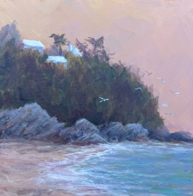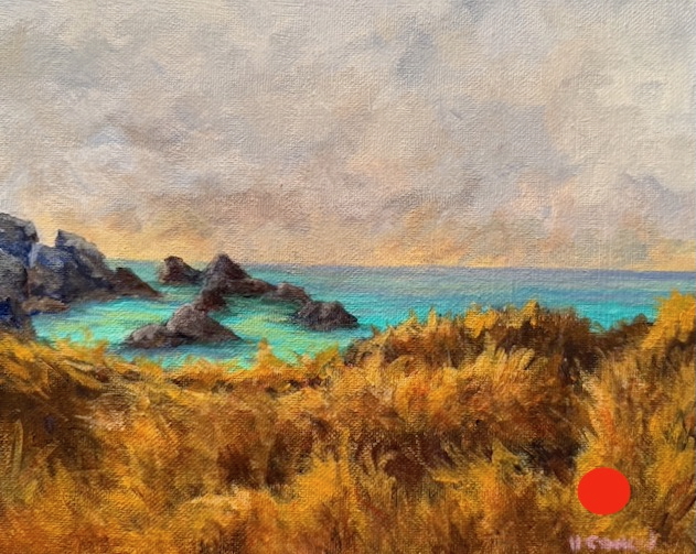 A really quiet area. Painted this on location during the winter… Not a soul around. The grass stretch above the rocks is part of the old railway trail that runs past the old Ferry Master’s House.
